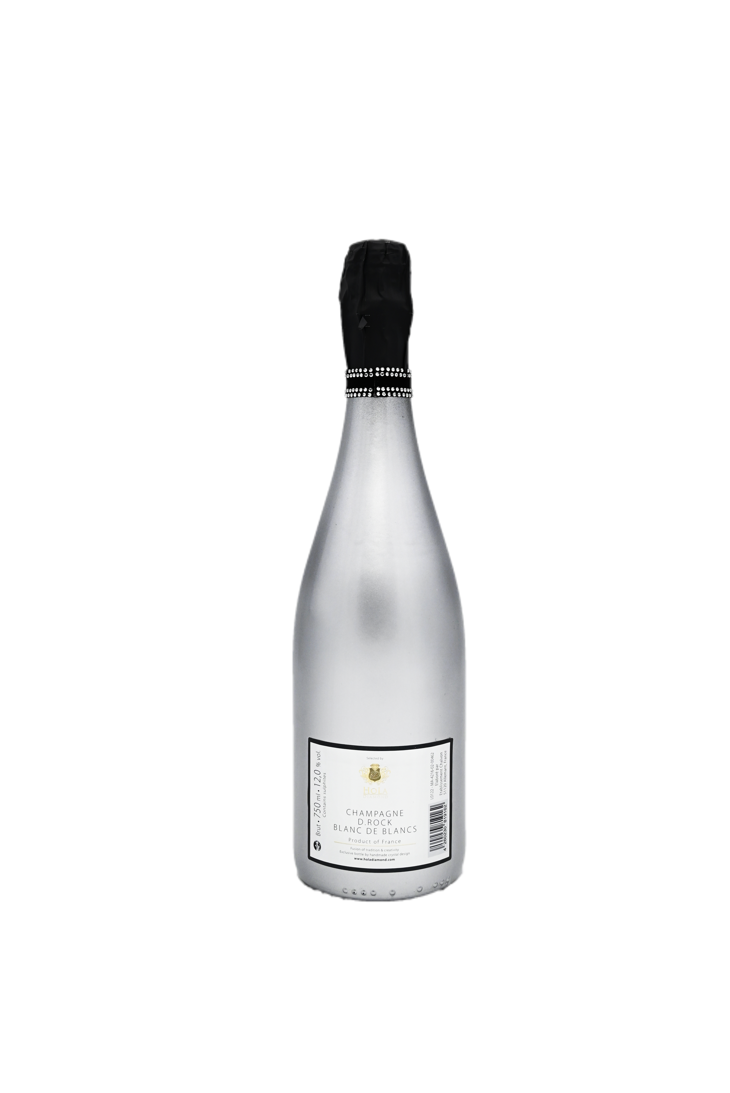 Champagne D.ROCK is produced by a small, idyllic family business located in the Champagne region, France. It’s a blend of Chardonnay and Pinot Noir grapes, that grow on local vineyards and get hand-picked every year. “A floral character with a hint of honey and lime” is the best description for our delicious champagne, which doesn’t only stand out because of its great taste, but also because of its handmade golden bottle. After all we not only strive to create uniqueness in taste, but also in design. That’s why every single one of our black, sightly frosted bottles gets studded with over 1000 crystals. We use synthetic “Luk-Dymand” crystals, assemebled carefully by hand on smooth velveteen. These crystals have a unique sparkle and a living play of colors, but still are very robust. After the crystals are in place on the velveteen, a special trained employee attaches the whole piece to the bottle. Blanc de blancs- 100% Chardonnay, 10gr Sugar.Brut, 3 years aged in the bottleBrand: