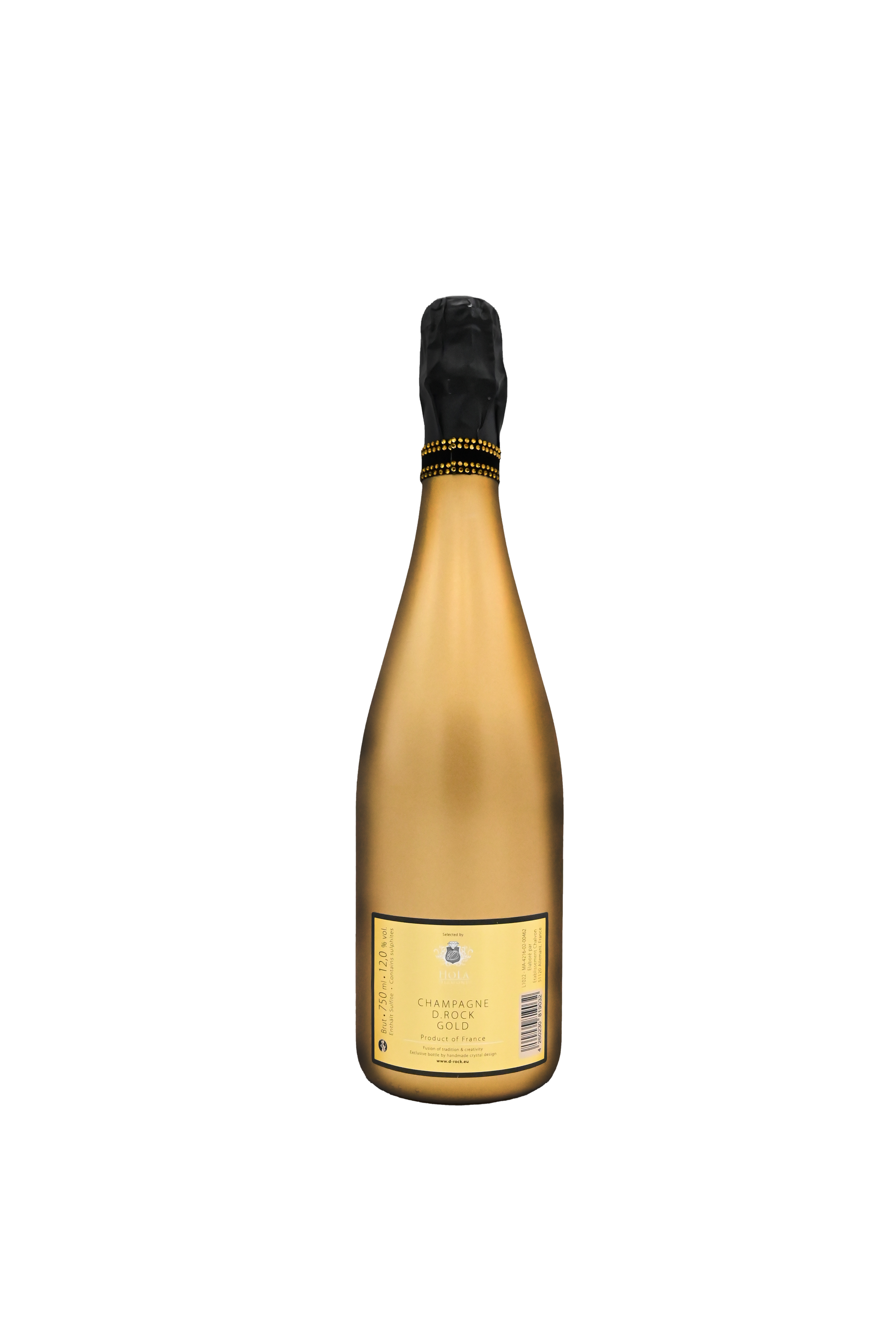 Champagne D.ROCK is produced by a small, idyllic family business located in the Champagne region, France. It’s a blend of Chardonnay and Pinot Noir grapes, that grow on local vineyards and get hand-picked every year. “A floral character with a hint of honey and lime” is the best description for our delicious champagne, which doesn’t only stand out because of its great taste, but also because of its handmade golden bottle. After all we not only strive to create uniqueness in taste, but also in design. That’s why every single one of our black, sightly frosted bottles gets studded with over 1000 crystals. We use synthetic “Luk-Dymand” crystals, assemebled carefully by hand on smooth velveteen. These crystals have a unique sparkle and a living play of colors, but still are very robust. After the crystals are in place on the velveteen, a special trained employee attaches the whole piece to the bottle. BRUTE GOLD- 50% Chardonnay, 50% Pinot Noir, 10gr Sugar. Brut, 2 years aged in the bottleBrand:
